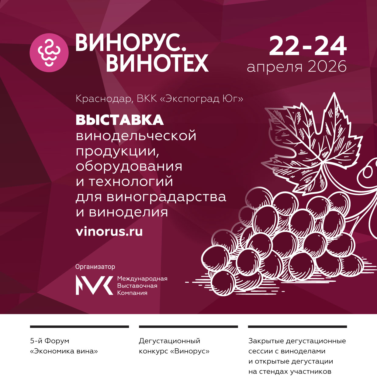 22–24 апреля в ВКК «Экспоград Юг» состоится выставка «Винорус.Винотех». В рамках деловой программы выставки пройдёт 5-й форум «Экономика российского вина». Вход на форум свободный для посетителей выставки.Пятый год подряд форум собирает в Краснодаре профессиональную аудиторию винодельческой индустрии: производителей, поставщиков, дистрибуцию, торговые сети, алкотеки, HoReCa и отраслевых экспертов. Форум даёт фактуру по рынку российского вина, которую рестораторы, кависты, сомелье, закупщики и категорийные менеджеры могут применять в закупках, винных картах и стратегии на сезон 2026–2027. Виноделы получат актуальный срез аналитики по трендам спроса, обратную связь от участников рынка и возможность обсудить вопросы стиля и качества российских вин.
